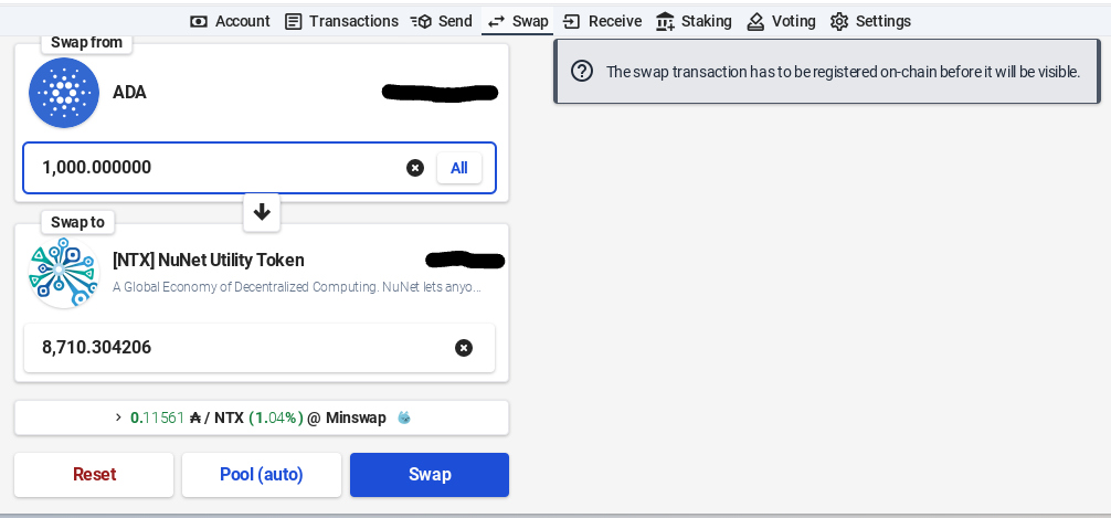 - Put in the amount of ADA desired to trade and click "Swap". After signing the transaction, the swap should complete within a few minutes.